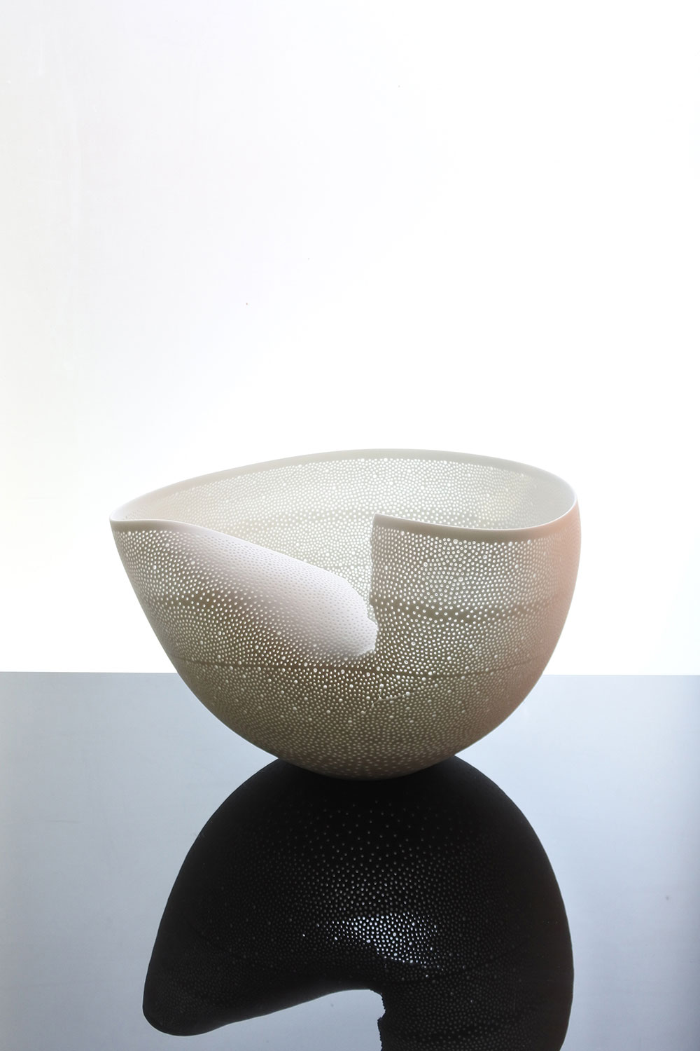 Niisato is an up-and-coming ceramicist who has drawn international attention for his signature “luminescent vessels.” He creates perforations in the clay of thrown white porcelain forms, which he then coats with a clear glaze and fires. The translucent patterns created by the glaze-filled perforations are Niisato’s original take on delicate hotarude (“firefly”) ware. In recent years, he has focused on the relationship between works and their surroundings, creating a new series of spherical objects liberated from display surfaces and studio exhibition spaces.