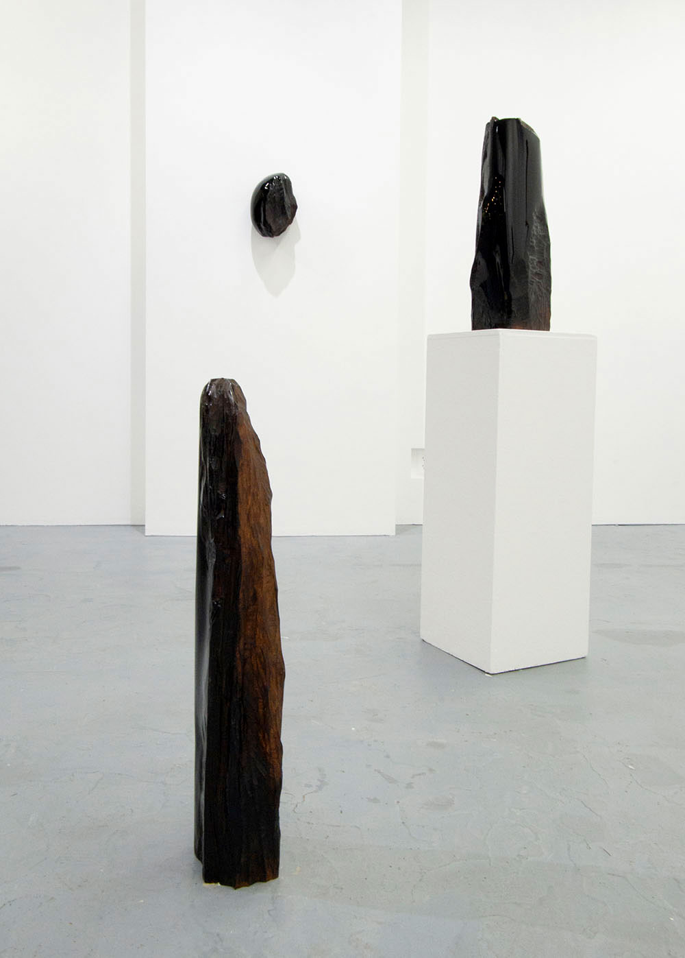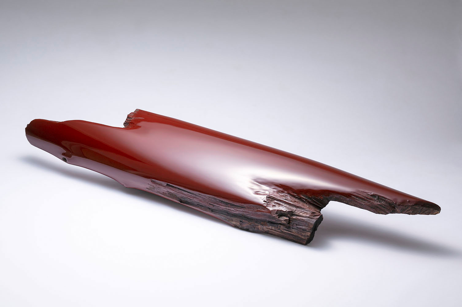 Lacquer (urushi) has long been used as a natural adhesive and sealant for items such as bowls and boxes. Ukai first studied lacquer at university. His works focus on the spontaneous forms that arise through repeated iterations of lacquering and burnishing. His work for this exhibition is his largest to date. The wood for the piece was cut from a fallen tree that Ukai found within the Natadera Temple precincts. The finished work breathes new life into the fallen tree, which would have otherwise been disposed of as a dangerous obstruction on the temple grounds.