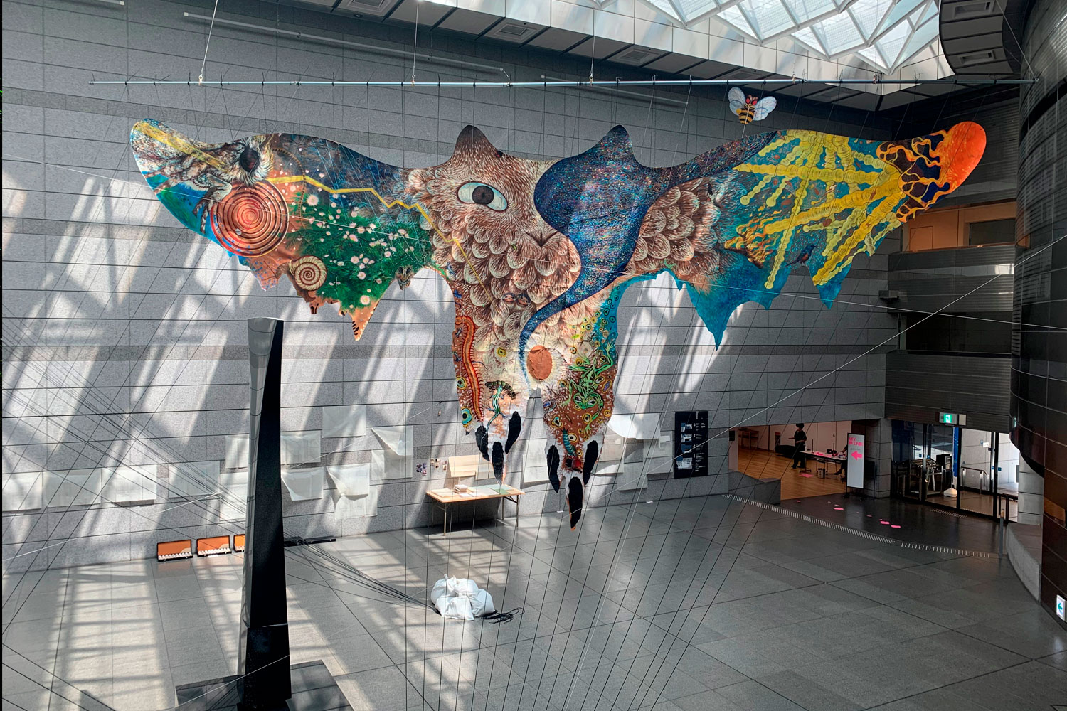 From Takamatsu to Echizen Leather Black Kite. 2022. Cowhide, mixed media. Installation view from The Birth of Seeing, Takamatsu Art Museum. H. 600, W. 1,200 cm.