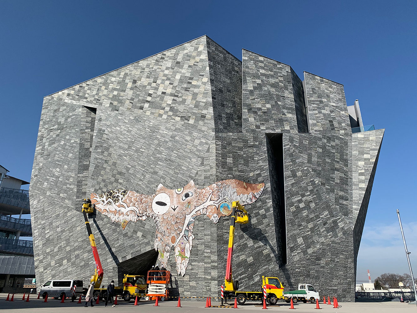 Musashino Black Kite. 2021. Cowhide, mixed media. Installation view from the Kadokawa Culture Museum. H. 1,000, W. 2,400 cm.