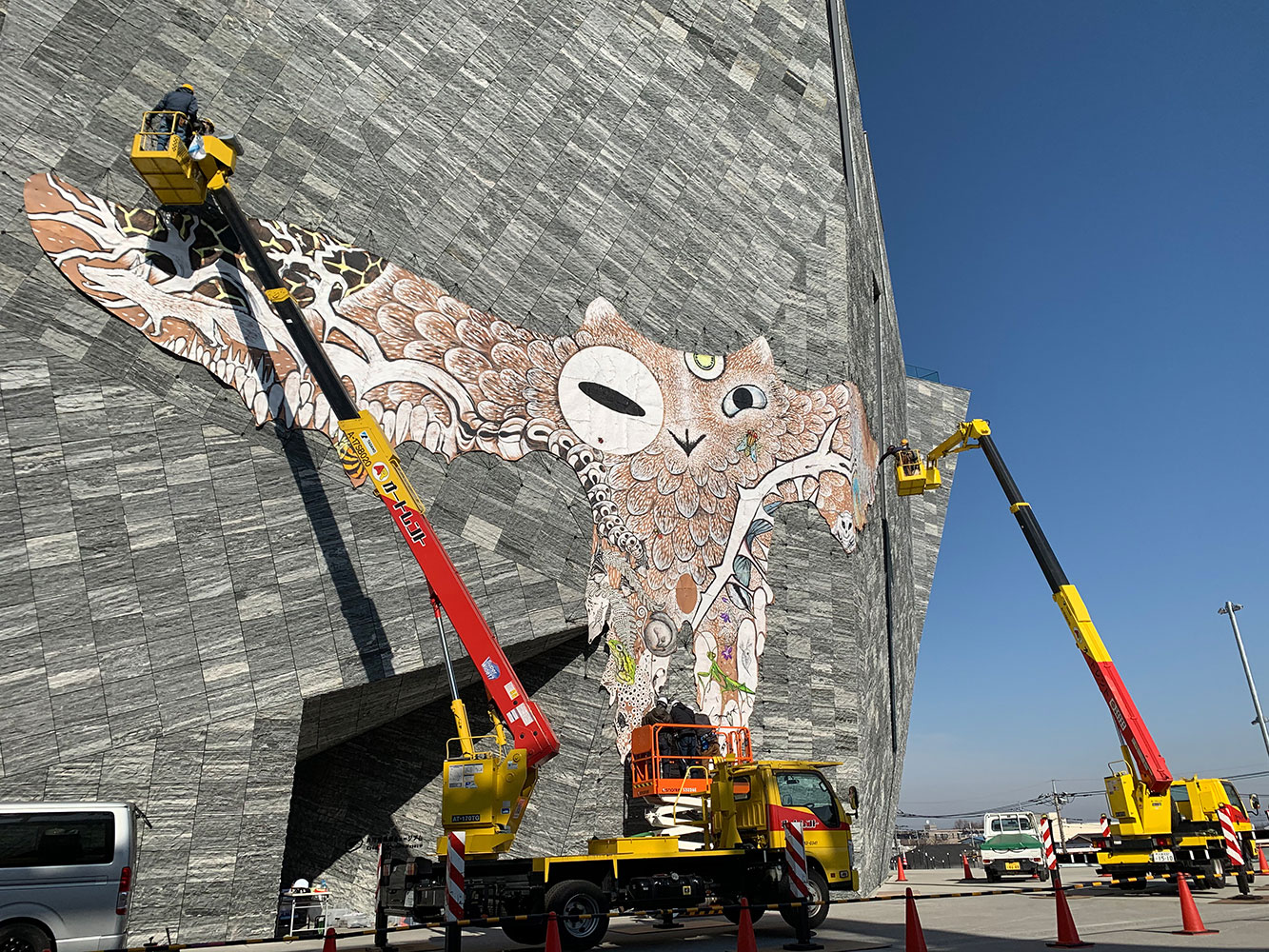 Konoike continues to address fundamental questions about art through mediums such as painting, sculpture, cinematography, animation, and narrative. In recent years, her works have incorporated new methods inspired by the people, languages, natural environments, and wildlife that she encounters in her travels. Her work for this exhibition, From Takamatsu to Echizen Leather Black Kite, was created by sewing together split leather from cowhides. Exposed to the elements, left bare to the ravages of the sun and the rain, the work explores questions surrounding the relationship between materials and crafts and the fundamental question of what it means to live in this region.